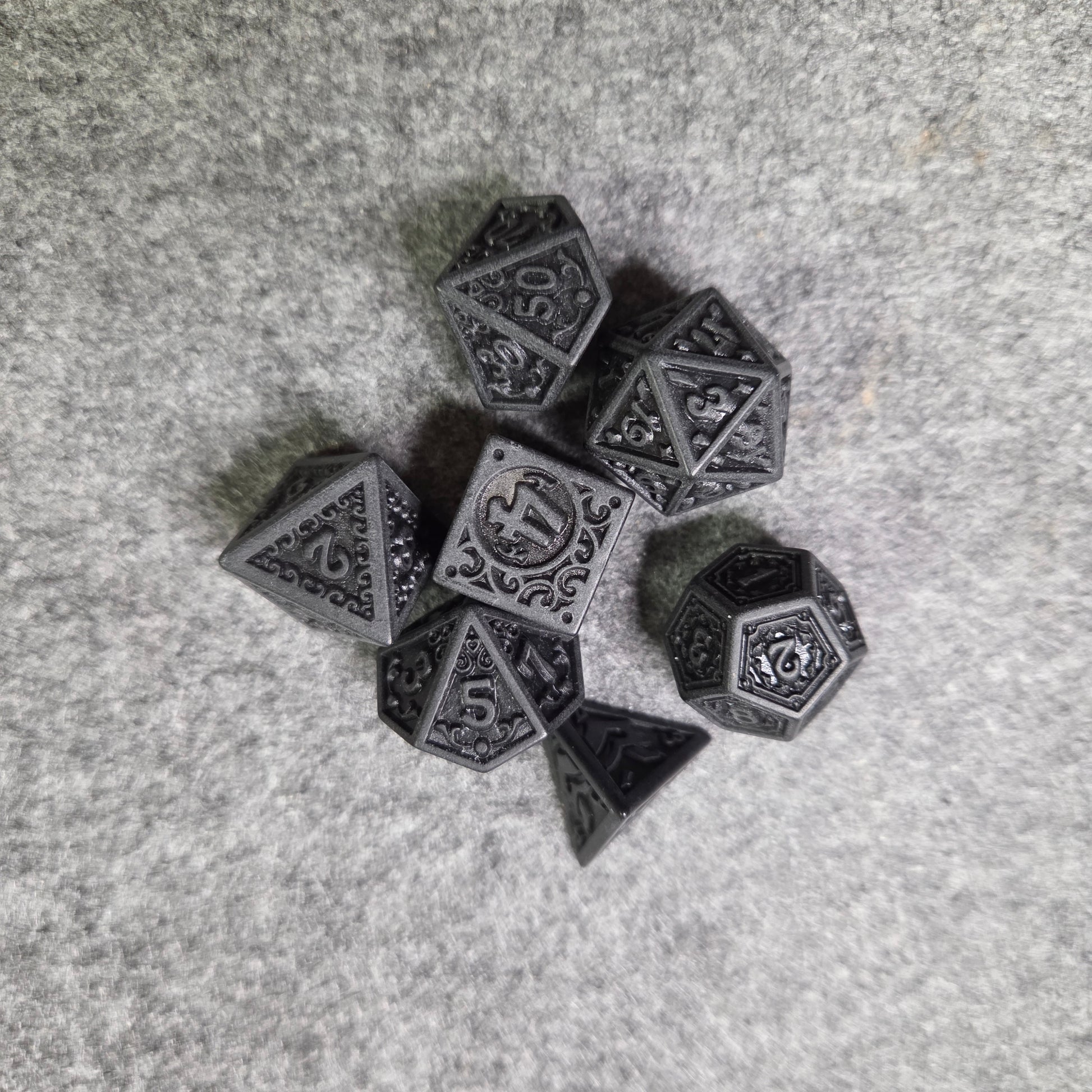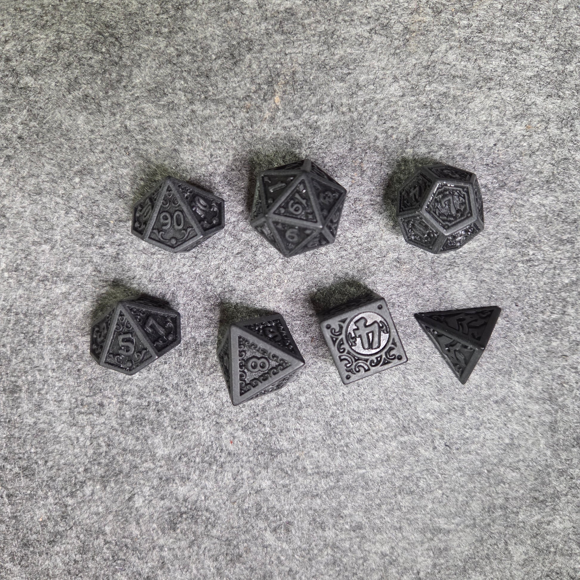 Würfelset mit einem 4er, 6er, 8er, 10er, 12er und 20 seitigen Würfel.